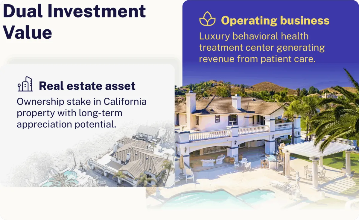 Valley Wellness is a luxury behavioral health facility set on 4.2 acres of California property. The investment provides dual value, where investors own equity in both the real estate and the operating business.