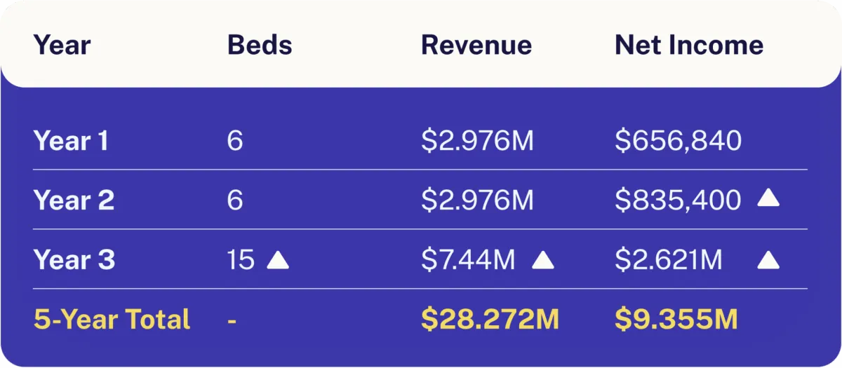 The 4.2-acre site is zoned to expand from 6 beds to 15 beds. Capacity growth triples revenue while increasing property value.